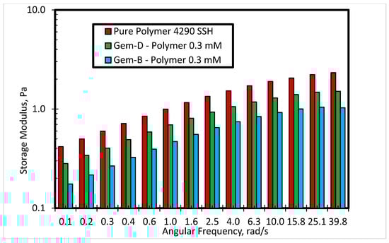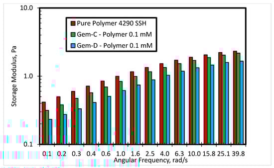 Figure 10 presents the effect of spacer nature and counterions on shear viscosity at constant surfactants’ concentration of 0.1 mM, while Figure 11 and Figure 12 show the impact of spacer nature and counterions on storage modulus at 0.3 and 0.1 mM surfactants, respectively. The intensity of viscosity reduction is higher for surfactants with bromide counterions as compared to the surfactant with chloride counterions (Figure 10). Gem-B and Gem-D contain similar counterions (bromide), but shear viscosity profile for Gem-D is above that of Gem-B, which reveals that viscosity reduction decreases by the addition of another phenyl ring in the spacer. A similar trend was also observed between Gem-A and Gem-C, but the difference was insignificant. Gem-B gives the lowest viscosity of the SP solution at 0.1 mM and 80 °C.