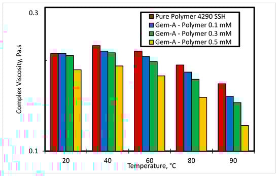 Figure 13 and Figure 14 show the effect of temperature at various concentrations of Gem-A in the SP system on storage modulus and complex viscosity, respectively. The angular frequency for these experiments was kept constant at 10 rad/s, and the temperature was varied from 20 °C to 90 °C. Increasing temperature results in a reduction in both storage modulus and complex viscosity, as shown in Figure 13 and Figure 14, respectively. Increasing temperature reduces the intermolecular forces of the material, and hence reduces the elasticity and complex viscosity. This effect enhances at higher surfactant concentrations.