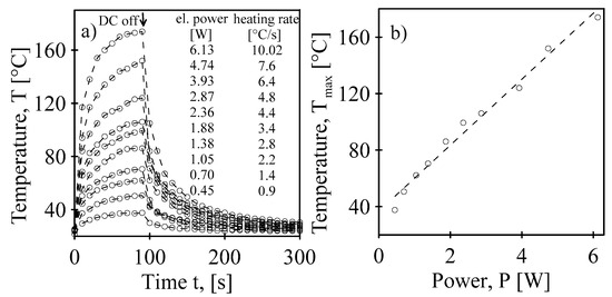 (a) Temperature progression of the MWCNT nanopaper through Joule heating at different electrical power rates and an initial heating rate. (b) The dependence of the reached maximal temperature on the applied DC electrical power through Joule heating.