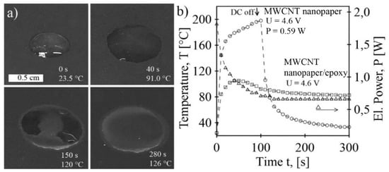 The temperature progression induced by the imposed electric power on the MWCNT nanopaper and the dependence of the reached maximal temperature on the electric power are shown in Figure 1.