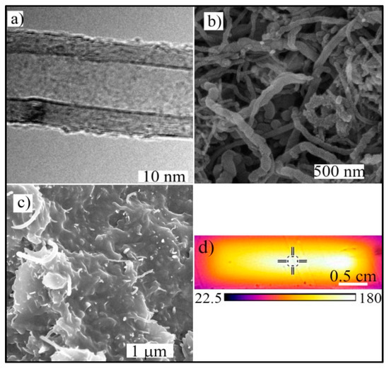 A detailed view of the structure of an individual nanotube consisting of about 15 rolled sheets of graphene obtained by means of TEM is shown in Figure 5a. SEM micrographs depict the surface of a porous structure of the MWCNT nanopaper (Figure 5b), and the cross-section through the epoxy composite with the embedded conductive MWCNT nanopaper with some nanotubes protruding from the epoxy matrix surface together with cut nanotubes (bright spots on the surface), Figure 5c. Finally, Figure 5d depicts the temperature distribution of the MWCNT nanopaper/epoxy strip as measured by thermal camera Flir E5-XT in the course of the curing by means of the embedded Joule-heated carbon nanotubes. The temperature of the strip decreased towards the edges, apparently due to higher cooling in the marginal areas.