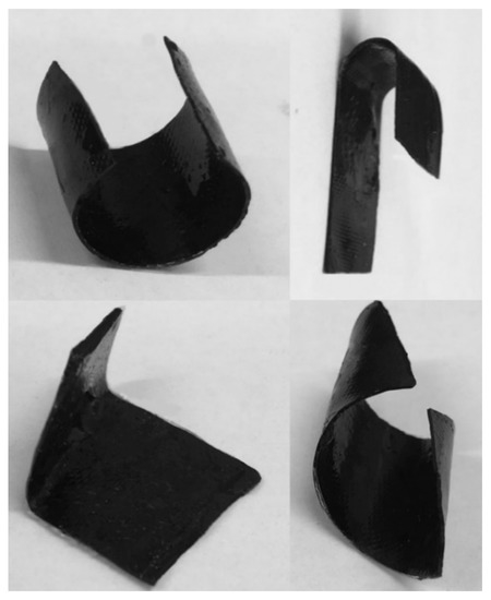 The fabricated thermoset composites, which consisted of the epoxy matrix and the embedded conductive MWCNT nanopaper, offer a novel technique of formation by means of Joule heating. This self-heating, which was used for the curing of composite plates and strips, was repeated to quickly heat the composite plates (in 1–2 min) to the forming temperature of 70 °C, which was above their glass transition temperature Tg of 53.9 °C. At this temperature, the composites went from being rigid and glassy to rubbery and flexible, and thus highly formable. When a bending force was applied, the strips deformed easily to the chosen shapes, which they held after cooling below Tg, despite the deformed embedded MWCNT nanopaper (Figure 6).