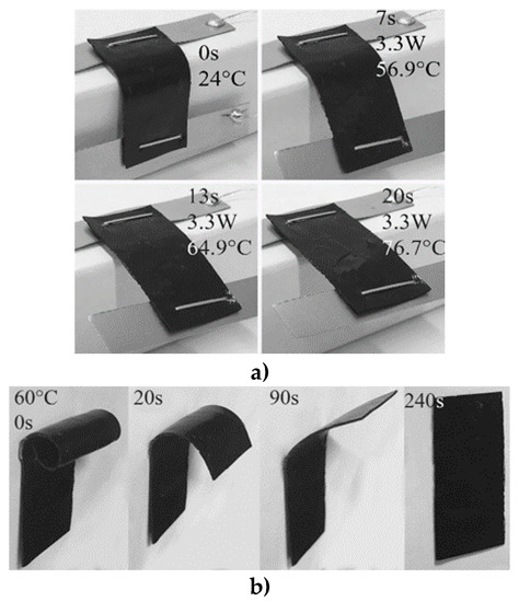 Surprisingly, when the bent strips were reheated (as described in Section 2), their original shape recovered. The photos illustrating recovery by means of both nanopaper self-heating and heating in an oven at 60 °C are shown in Figure 7a,b, respectively (see Supplementary Video). After the composite is heated over Tg to the transformation temperature of the shape memory, shape recovery stress in the embedded MWCNT nanopaper was released due to the epoxy matrix softening. Apparently, the embedded nanotubes were compressed on the inside surface of the bent strip and stretched on the outside. When the nanotubes were released and were able to move within the epoxy matrix, the deformed arrangement of the stretched portion and compressed portion of the nanopaper recovered to its initial arrangement. Moreover, the strip’s Joule heating through inter-nanotube contacts was more efficient than heating in an oven. Consequently, when Joule heating was applied to the bent composite strip attached to a box, the time of the strip shape’s unbending reached about 20 s (Figure 7a), which was about one order of magnitude shorter than that of the strip coiled portion’s recovery in the oven (Figure 7b).