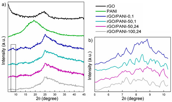 (a) Results of XRD diffractograms of (from the top) rGO, PANI; rGO/PANI-0,1; rGO/PANI-50,1; rGO/PANI-50,24 and rGO/PANI-100,24 samples. (b) Magnified view of the 2θ = 7°–8° peak.