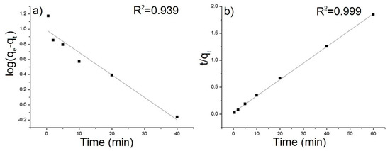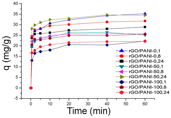 The equilibrium sorption capacity, qe was obtained in 40 mins. The results show that the equilibrium adsorbed concentration qe of AB129 range from 22.15 to 35.26 mg/g depending on type of composite. The lower values were reached by samples, which were synthesized at a higher temperature. The best result of qe was obtained by the rGO/PANI-0,1 composite (Figure 5) and therefore all further studies were performed only for this sample. To obtain the information on the adsorption rate and mechanism, adsorption kinetics were fitted with both pseudo-first and pseudo-second kinetic adsorption model (Figure 6). The R2 of the pseudo-second-order model (R2 = 0.999) is higher than one for the pseudo-first-order model (R2 = 0.939) which is in consensus with previous observations [60]. This result was also checked on the other composite samples, where in most cases the pseudo-second kinetic adsorption model fitted the data better (Table S1). This model also includes chemisorption which may be a rate-limiting step [61].