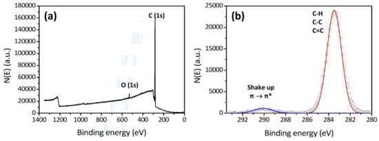 Zhang et al. used XPS analysis to support the adhesive property of polydimethylsiloxane-poly(glycidyl methacrylate (PDMS-PGMA) in graphene oxide (GO)/polymer nanocomposite papers [34]. The nanocomposite papers were prepared by filtration of mixing solution of PDMS-PGMA and GO (Figure 5a). Both survey scans of PDMS-PGMA and GO/PDMS-PGMA composite papers exhibited four peaks corresponding to C(1s), O(1s), Si(2s), and Si(2p), which indicated the co-existence of the polymer and GO in the composite papers. The deconvoluted high-resolution C(1s) spectra (Figure 5c) showed a peak corresponding to C-Si only in PDMS-PGMA paper, but not in the GO paper, suggesting C-Si peak can be a standard peak to distinguish the polymers. Also, the peaks corresponding to C-OH, C-O-C, C=O, and O-C=O groups shifted among GO, PDMS-PGMA, and GO/PDMS-PGMA papers, providing evidence for hydrogen bonding in the composite papers.