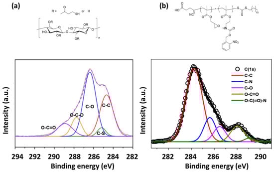 Deconvoluted C(1s) multiplex spectra of (a) a thiol-functionalized cellulose nanofiber mat (Reproduced from Reference [50] with permission from Elsevier) and (b) a photo-crosslinked thin film of poly(2-((((2-Nitrobenzyl)oxy)carbonyl)amino)ethyl methacrylate-r-glycidyl methacrylate) (Reproduced with permission from Reference [51]; Copyright (2015) American Chemical Society).