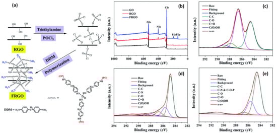 Hu et al. utilized an XPS analysis to monitor each step for the preparation of functionalized reduced graphene oxide (FRGO) [36]. The FRGO was prepared by chemical reduction of graphene oxide followed by polymerization of 4,4′-diaminodiphenylmethane on POCl2-treated reduced graphene oxide (RGO) (Figure 3a). The survey spectra revealed the newly appeared N(1s) for RGO and P(2s) and P(2p) for FRGO, which were attributed to the nitrogen doping of graphene during the reduction reaction of graphene oxide (GO) and the wrapped flame retardants on the RGO surface, respectively (Figure 3b,c). In the deconvoluted C(1s) multiplex spectrum of RGO in Figure 3d, a decrease in the relative peak areas of oxygen-containing groups is observed, indicating the successful removal of oxygen-functional groups during the reduction reaction. The diminish of C=O and O-C=O bands in FRGO could be attributed to the wrapping effect of flame retardants in the high-resolution C 1s spectrum of FRGO (Figure 3e).