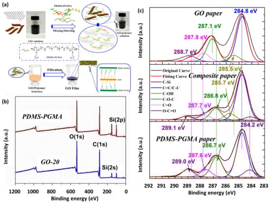(a) Schematic illustration for the preparation of GO/polydimethylsiloxane-poly(glycidyl methacrylate (PDMS−PGMA) composite paper achieved through mixing GO solution with PDMS−PGMA triblock copolymer, (b) survey spectra of PDMS-PGMA and GO/PDMS-PGMA composite papers, and (c) deconvoluted C(1s) XPS spectra of GO, PDMS-PGMA, and GO/PDMS-PGMA composite films. (Reproduced with permission from Reference [34]; Copyright (2016) American Chemical Society).