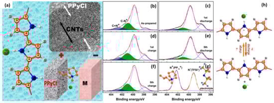 (a) Schematic illustration of PPyCl@CNTs cathode (a-g) XPS N(1s) multiplex scan of (b) as-prepared PPyCl@CNTs cathodes, and subsequent (c) first discharge and (d) first charge, (e) fifth discharge and (f) fifth charge, and (g) the electrolyte itself. (h) The charge/discharge mechanism in the portion of PPyCl. (Reproduced with permission from Reference [35]; Copyright (2017) American Chemical Society).