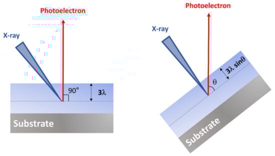 As mentioned earlier, the effective escape depth is correlated to the actual sampling depth, which is the function of the inelastic mean free path, the characteristic of the material itself. However, the various information of samples can be obtained by changing the incident angle. Tilting samples to have the angle to the surface as θ, the effective escape depth changes from 3λ to 3λsinθ (Figure 7). As a consequence, the detectable depth dramatically reduces to a smaller extent, and an XPS signal from the area closer to the surface, that is, the more surface-sensitive chemical composition can be obtained. This method is called angle-resolved XPS (ARXPS) analysis. By using this method, the chemical structure of the surface can be easily understood. When the thickness of polymer thin film is less than 3λ, non-destructive vertical chemical composition and distribution of the material surface also can be analyzed.