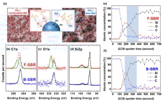 (a) TEM images, (b–d) XPS multiplex spectra, and (e–f) depth profiling results of the SiO2/functionalized styrene-butadiene (SBR) polymer (F-SBR, red) and SiO2/bare SBR (B-SBR, blue) nanocomposites. (Reproduced with permission from Reference [42]; Copyright (2015) American Chemical Society).