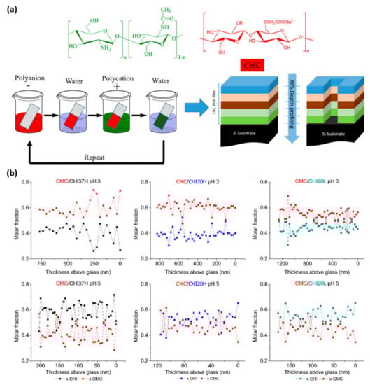 (a) Schematic illustration of preparation of layer-by-layer method using chitosan and XPS depth profiling. (b) Depth profiling of CMC/CHI systems (Reproduced with permission from Reference [59]; Copyright (2018) American Chemical Society).