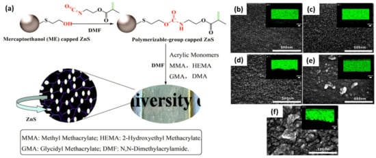 (a) Nanocomposite fabrication using ZnS nanoparticles surface-anchored with polymerizable group. (b–f) SEM images of hydrogel with different concentration of the ZnS nanoparticles, and EDS sulfur mapping (insets) for each nanocomposite hydrogel: (b) 50 wt%, (c) 60 wt%, (d) 70 wt%, and (e) 80 wt% of polymerizable-group-capped ZnS nanoparticles, and (f) 50 wt% physically embedded ME-capped ZnS. (Reproduced with permission from Reference [107]; Copyright (2018) American Chemical Society).