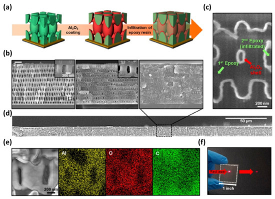 (a) Schematic illustration of the fabrication of 3D nanocomposite structure fabrication. (b) SEM cross-sectional image at each step. (c,d) Cross-section SEM image by intensive ion beam (FIB) of (c) high- and (d) low-magnification cross-section. (e) EDS mapping images of Al, O, C elements for the 3D nanocomposite. (f) Photographic image confirming transparency of the fabricated structure. (Reproduced with permission from Reference [24]; Copyright (2018) American Chemical Society).