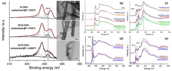 (a) XPS spectra and TEM images, and near-edge X-ray absorption fine structure (NEXAFS) spectra of (b and d) C(1s) K-edge, (c and e) N(1s) K-edge nanofiber samples made from PANI. (Reproduced with permission from Reference [126]; Copyright (2016) American Chemical Society).