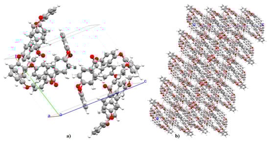 The packing density ρp for the unit cell of o-PEEK was calculated to be 1.320 and 1.395 g⋅cm−3 with PBEsol. These were evaluated using the 1 × 1 × 1 and 2 × 2 × 2 k-point meshes, respectively. The PBE functional in conjunction with the 1 × 1 × 1 and 2 × 2 × 2 k-point meshes gave ρp values of 1.267 and 1.340 gcm−3, respectively. The MD simulation gave a ρp of 1.364 gcm−3. Clearly, the calculated accuracy compared to the experimental ρp value of 1.32 g⋅cm−3 is (theoretical) model dependent []. Even so, these results suggest that the quantitative estimation of ρp for this type of material using theoretical methods is not far from reality. For PEEK, the experimental densities have been reported to be in the range of 1.26–1.32 gcm−3 [].