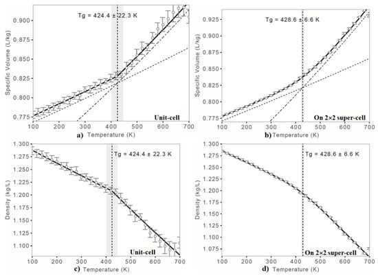 The changes in the slope of both the curves shown in Figure 2a,c were 424.4 ± 22.3 K, regardless of whether the volume-temperature profile or the density-temperature profile were used. As noted above, and when the 2 × 2 × 2 supercell geometry was used, both the density and volume were slightly affected. Therefore, the slopes of the corresponding curves shown in Figure 2b,d were changed and the resulting Tg values were estimated to be 428.6 ± 6.6 K.