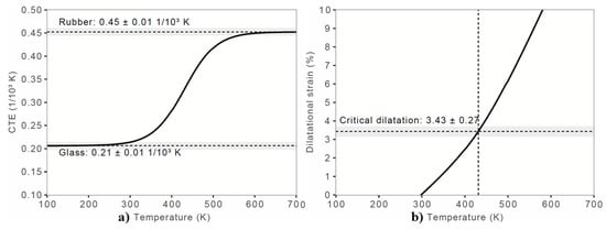 Figure 3a shows the nature of the CTE as a function of temperature. It represents a pseudo-second order transition. Since the CTE is a measure of the expansion or contraction of a material as a result of changes in temperature [,], the pseudo S-shaped nature of the plot suggests that the material should contract upon decreasing the temperature from 600 to 300 K, and this behavior is typical of the glass transition region when cooling from the supercooled melt to glass [,]. Nevertheless, the CTE is found to be positive, and is different above and below Tg. It is equal to 0.21 ± 0.01 × 10−3 K−1 when the material behaves like a glass and equal to 0.45 ± 0.01 × 10−3 K−1 in the rubber state. The values suggest that the CTE of the material in the glassy state is almost double compared to that of the rubbery state. In addition, the critical dilation for the material was found to be 3.43 ± 0.27 (Figure 3b). The corresponding values obtained with the 2 × 2 × 2 supercell model of o-PEEK were 0.23 ± 0.02 × 10−3 K−1, 0.47 ± 0.02 × 10−3 K−1 and 3.46 ± 0.20, respectively, showing a very marginal effect of cell size on the properties of o-PEEK.
