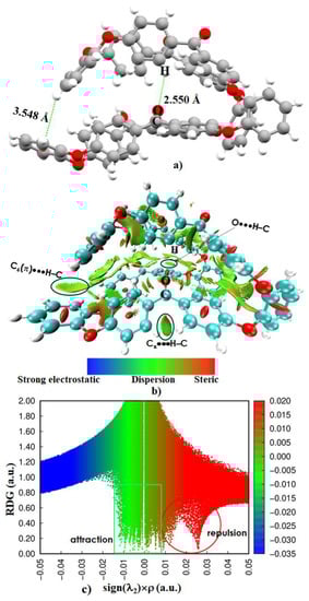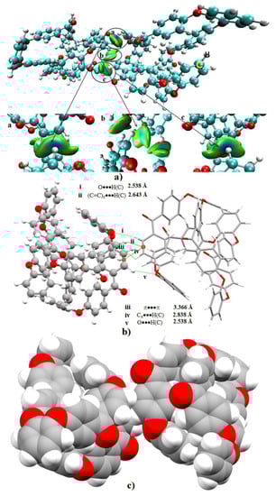 Due to the relatively large size of o-PEEK’s binary systems, the IGM approach was used to analyze the nature of the reduced charge density topologies. Figure 5a represents the corresponding results of a binary complex geometry of o-PEEK. It was extracted from the unit-cell of o-PEEK (Figure 1a) by removing the periodic boundary conditions. The promolecular approximation was utilized [,]. In this approximation, the atomic electron densities are summed up, but the associated atomic gradients are not allowed to interfere. The isosurfaces enclose the bond critical points and also accounting for in extracting the desired interaction present in |∇ρ|. In any case, the intermolecular region in the binary complex shown in Figure 5a comprises of three individual isosurfaces. These are marked by a, b and c; the local images corresponding to these isosurfaces are magnified at the bottom of Figure 5a.