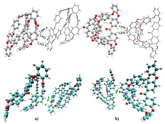 The large stabilization energy for each of the two complexes in Figure 7 is not very surprising. The two oligomers in each system are coupled with each other via multi-fold intermolecular interaction topologies. These are long-ranged and well-dispersed, as demonstrated by the IGM isosurfaces shown at the bottom of Figure 7. The O···H(C), (C=C)π···H(C) and Cπ···H(C) contacts are common to both (a) and (b). However, the (C)H···H(C) contacts are prominent in the former and the (C=C)π···H(C) and (C6)π···H(C) contacts are prominent in the latter, in agreement with the spread in the isosurface topology that appears in the intermolecular (interfacial) region.