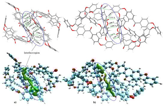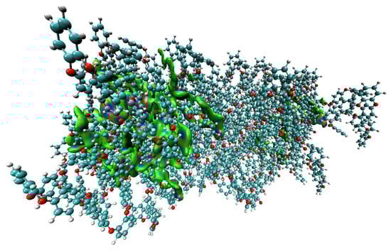 Isosurface a exhibits the combined effect of three interaction types, and is equivalent to isosurface c due to symmetry. The irregular greenish regions corresponding to the left and right portions of each isosurface represent the Cπ···H(C) and O···H(C) interactions, respectively, whereas the intermediate bluish-green semicircular portion of the same isosurface corresponds to (C=C)π···H(C). Similarly, isosurface b is the combined effects of π···π stacking (parallel displaced) and Cπ···H(C) contacts. The former is the consequence of attraction between the π-electron densities associated with the C=C double bonds of the aromatic rings of the two oligomers that are in close proximity. The latter is due to the attraction between the π cloud on the C atoms of the C=C bond in one oligomer and the H atom of the second interacting oligomer. Noncovalent bonding interactions of this kind are common in chemical systems where aromatic and/or non-aromatic fragments are in close proximity to each other, such as benzene dimers, epoxy composites, and similar systems that comprise Lewis bases of different types [,,,,,,,,,,,,].
