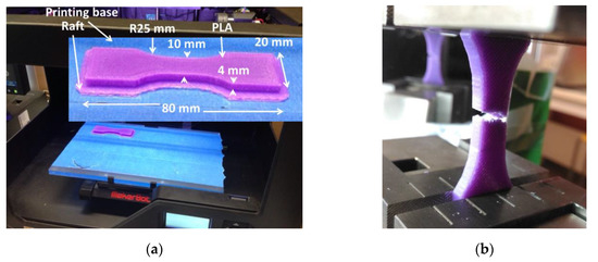 Tensile specimen printed using FDM: (a) Sample dimensions; (b) result of tensile testing.