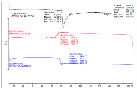 Figure 3 shows that DSC measurements suggest, at the first heating stage, a glass transition Tg of PLA of 62 °C and melting temperature around 157 °C. Kim et al. [21] reported a similar Tg value (62.9 °C) and a slightly larger melting temperature (167.2 °C) for PLA similar to the one considered in this study. The presence of single peaks close to the relaxation and melting points indicates a clear Tg and simple melting event. During the cooling stage, Tg is captured around 51 °C and there is no evidence of crystallisation. At the second heating run, Tg is close to 58 °C.
