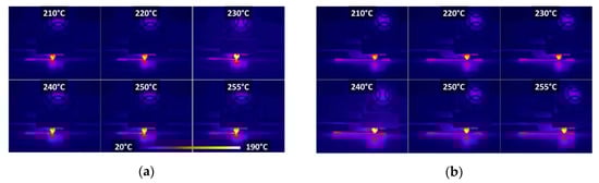Infra-red recording of PLA temperature: (a) after the first 14 s and at; (b) the end of the printing sequence as a function of the printing temperature.