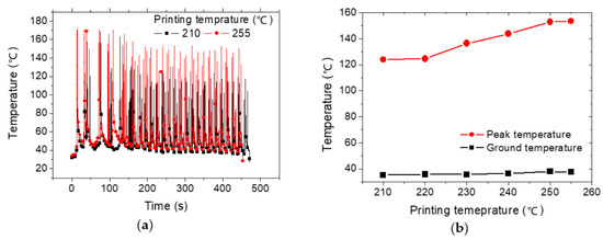 In particular, Figure 5a shows the thermal cycling for two extreme printing temperatures. Although, the low limit for printing temperature used in this study (210 °C) is commonly used for PLA, high processing temperatures such as 255 °C may result in PLA degradation process. Coppola et al. [22] conducted a thermogravimetric analysis (TGA) up to 700 °C, which shows weight loss values of 25% at temperatures starting from 346 °C. Their results suggest that the thermal stability of PLA is not compromised at 255 °C. Silverajah et al. [23], in an earlier work, report a slightly lower degradation temperature for PLA of 325 °C.