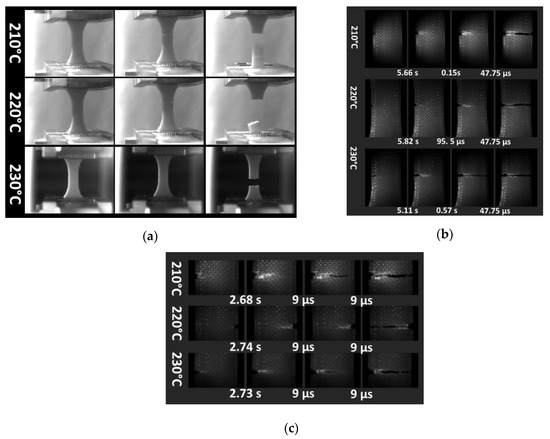 Figure 7 illustrates the recorded deformation sequences by a high-speed camera of 3D-printed PLA under various conditions. For neat specimens (Figure 7a), the increase in the printing temperature from 210 to 230 °C does not lead to a significant change in the rupture scenario.