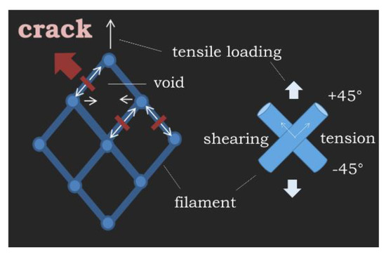 The comparison between the as-received and printed PLA performance shows that there is a loss of mechanical performance that can be also correlated to the printing temperature. Figure 9 provides a qualitative explanation for this difference based on the load transfer schematic for a typical 3D-printed structure. The first difference is in the deformation modes. For a raster with a pill ups of −45°/+45°, the deformation of the printed structure combines both shearing and tension while the as-received material is only subject to pure tension. In addition, the voids left within the raster act as stress concentrations and result in lower stiffness and strength. The presence of such voids is responsible for the stress heterogeneity in the printed PLA. In contrast to this stress heterogeneity that develops in the entire 3D-printed part, the stress distribution within the as-received wire subject to tensile loading is more homogeneous if the stress concentration at the grips is excluded. Finally, the particular arrangement of the filaments in the 3D-printed part allows only a limited part of the filament to be stretched, which also causes inhomogeneous deformation. At these locations, the PLA filament deforms up to its elongation at break. This effect is more amplified for filament with larger ultimate properties such as copolyester [26]. By opposition to this varied streching, the tensile loading of the as-received wire is uniform along a large part of its length.