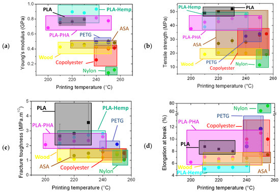 Tensile properties of eight different feedstock materials for FDM including PLA used in this study: (a) Young’s modulus, (b) tensile strength, (c) fracture toughness, and (d) elongation at break.