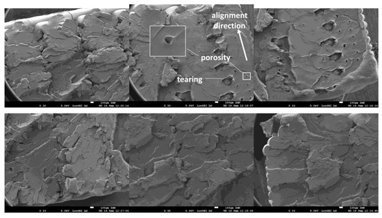 Fracture patterns of 3D-printed PLA are discussed through SEM micrographs in Figure 11. Alteration of filament compactness is limited and the fracture can be qualitatively related to filament tearing and stretching.