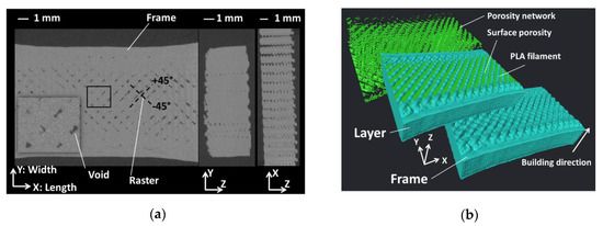 Main microstructural features of the 3D-printed PLA revealed using X-ray micro-tomography: (a) cross-section views; (b) porosity network and filament arrangement.