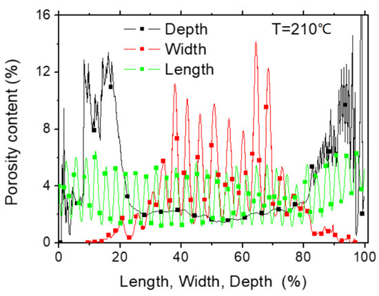 Evolution of the porosity content in the main orthogonal directions of 3D-printed PLA (sample dimensions 17 × 13 × 4 mm3).