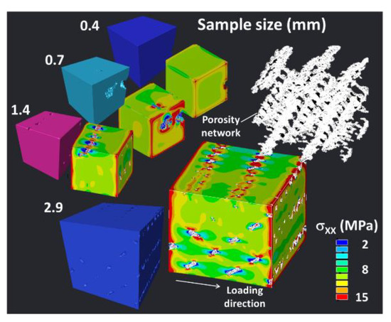 For sample dimensions larger than 1.4 mm, the effect of porosity alignment tends to connect regions of higher stresses. Up to 2.9 mm, there is evidence of alternation between high and low stress fields that fully connect the entire sample. This large stress heterogeneity is due to the significant connectivity within the porosity network. The predicted Young’s modulus is linearly correlated to the sample size as long as this one is small then 3 mm. This correlation can be written as follows: