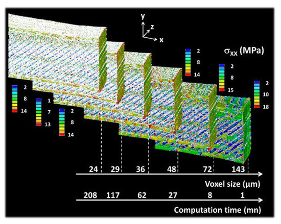 Effect of increasing the voxel size on stress component σXX counterplots (large voxel size represents a low resolution, X is the loading direction).
