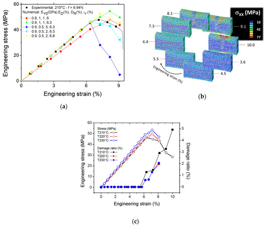 Damage modelling results: (a) Predicted tensile responses of 3D-printed PLA for various combinations of damage model parameters and a printing temperature of 210 °C, (b) typical predicted stress component σxx counterplot for an increasing engineering strain, and (c) tensile response as a function of printing temperature using linear damage model.