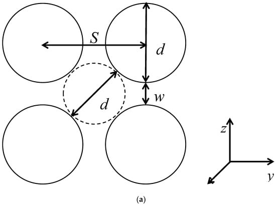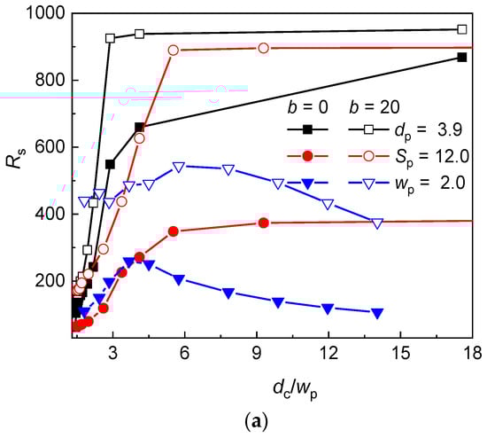 The nanoposts were organized in a parallel way in a square lattice as displayed in Figure 1. The axes of nanoposts were collinear with the x coordinate. The post diameter was kept constant at Dp = 3.0 and thus the effective post diameter was dp = 3.9 while the spacing between the post axes was varied in the 4.0–60.0 range. The evolution of the structure of the confined chains with the variation of the geometry of the nanopost array at constant dp is compared with the evolution at constant Sp = 12 with dp covering the range 1.9–11.9 and at constant wp = 2 with Sp and dp in the intervals 3.9–62.9 and 1.9–60.9, respectively [49,50]. It has been shown that the structural behavior of a chain confined in the array of nanoposts depends on the way in which the geometry of nanopost array is modified. The size of the interstitial volume, dc = Sp − dp, is approximated by the size of a quasi-channel (Figure 1a). Table 1 collects the geometrical parameters of nanopost arrays as well as the parameters quantifying the confinement strength, i.e., the geometry ratio and the volume fraction of the posts .