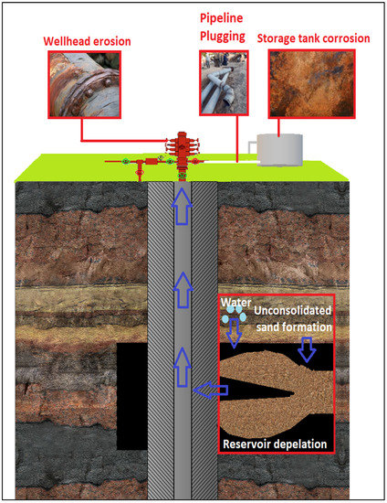 Sand production induces some problems, which includes downhole or wellhead equipment erosion and plugging, and subsidence of formation rock and walls demolition. In addition, it could also lead to a decrease in reservoir recovery, heightened maintenance cost, stimulation in the operational aspects problems and equipment damages, as well as other problems related to health, safety and the environment [14,15], Figure 1. Sand production constitutes erosion in surface and downhole equipment, i.e., growth the workover jobs. Sand production accumulate in downhole and surface equipment to rise the time and cost for cleaning. Sand production can plug the perforations to decrease the efficiency of production. Sand production decreases permeability and increases the pressure drop in the perforation tunnel because of void formation around perforation tunnel during sand production [3].