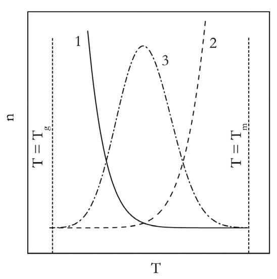 Figure 1. Temperature dependence of the nucleation rate (Equation (8)). 1: exp(−ΔG*/RT); 2: exp(−ED/RT); 3: product of 1 and 2. Adapted with permission from Vyazovkin [33]. Copyright Elsevier 2008.
