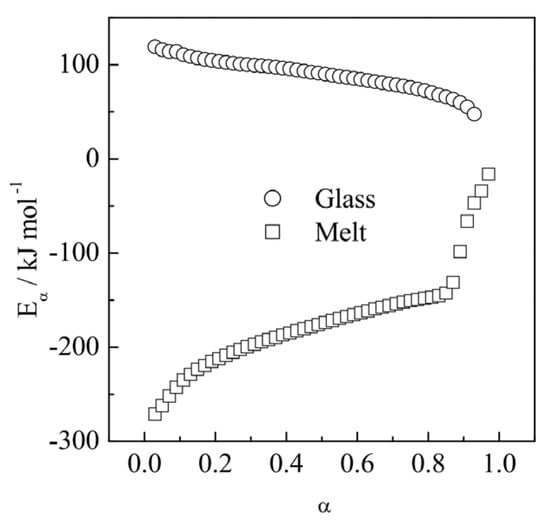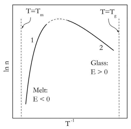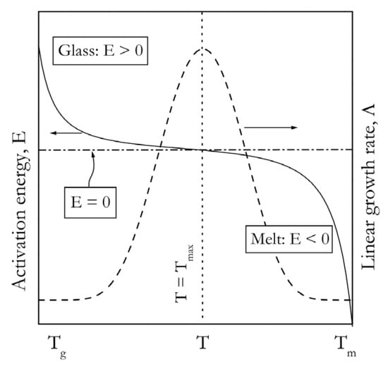 The resulting activation energy is clearly temperature dependent. This dependence is depicted in Figure 3 [54]. Again, we can see that the E values are negative when crystallization is induced by cooling the melt (temperature range TmaxTm), and positive when it is induced by heating the glass (temperature range TgTmax).