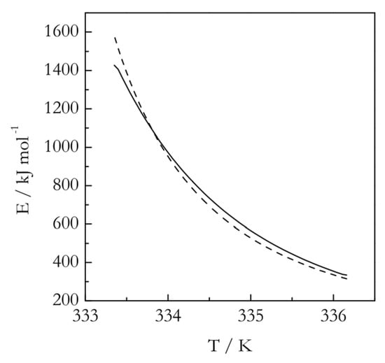 Based on Equation (4), E is estimated from the slope of the Arrhenius plot, lnk vs. T−1, which is supposed to be linear (i.e., E is supposed to be constant) over the whole temperature range. The principal difference between Equations (2) and (4) is that the former defines the activation energy as a single value averaged over the whole experimental range of temperatures. Equation (2), however, is recommended [9] as a more general definition of the activation energy, because it defines it as a temperature specific value and, thus, permits its evaluation, even if the lnk vs. T−1 plot is not linear. Such behavior is sometimes termed as non-Arrhenian. This terminology is rather confusing, because nonlinear Arrhenius plots can arise from a combination of two or more flawlessly linear lnk vs. T−1 plots, each of which represents perfectly Arrhenian behavior [10].