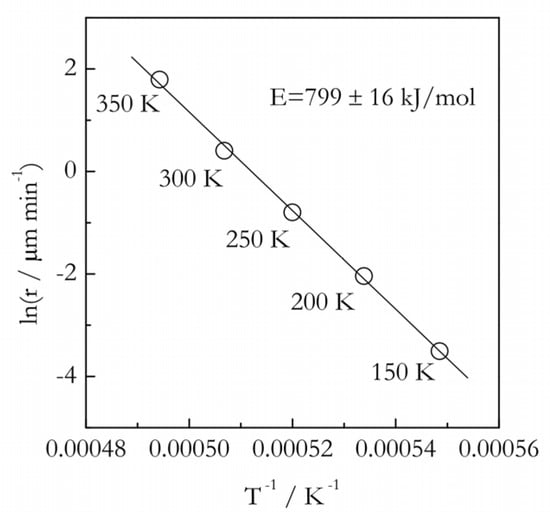 Figure 7. Arrhenius plot for the rate (r) of quartz melting (data from Ainslie et al. [65]). Numbers by the points represent the value of superheating at given temperature. The solid line is a fit to the Arrhenius equation with the activation energy 799 ± 16 kJ·mol−1.