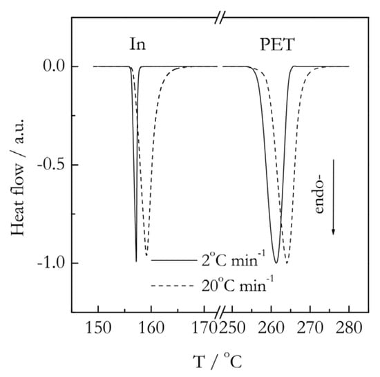 Figure 8. Normalized DSC curves for melting of indium (In) and poly(ethylene terephthalate) (PET) at the heating rates 2 and 20 °C min−1. PET data adapted from Vyazovkin [81]. Copyright 2014 Wiley-VCH.