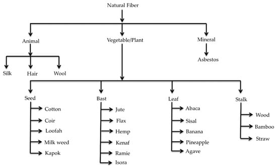 Natural fiber classification, according to the origin, with examples. Adapted with permission from Elsevier []. Copyright Elsevier, 2019.