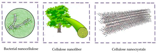 Nanocelluose is a general term used for cellulose nanocrystals (CNC), cellulose nanofibers (CNF), and bacterial nanocellulose (BNC), as shown in Figure 6. Natural fibers (ramie, jute, sugarcane bagasse, and coconut, etc.), wood, herbs, and organisms can be used for the isolation of cellulose nanocrystals. However, the removal of all non-cellulosic parts (hemicellulose, lignin, pectin, wax, and other extractives) is necessary before the isolation process can start. The cellulosic contents are exposed by different pre-treatment processes (bleaching, mercerization, pulping, and enzyme) of lignocellulosic fibers. Natural nanoparticles can be synthesized by using various methods, such as mechanical processes, including sonication, grinding, and homogenizing, or chemical treatments (ionic liquid and acid hydrolysis), or by using both types of combined processes (steam explosion) [,,]. CNF entails amorphous regions which are composed of stretched cellulosic nanofibers providing higher mechanical properties, whereas CNC has a higher rigidity, resulting in an elevated Young’s modulus, tensile strength, and thermal stability []. On the other hand, BNCs have a higher molecular weight and are synthesized from different bacterial species (Rhizobium, Sarcina, Agrobacterium, and Pseudomonas), providing higher water retention and Young’s modulus values. Nanocellulose could contribute to obtaining a higher tensile strength, higher viscosity, higher elastic modulus, and lighter weight in NBCs. However, there are also some challenges facing cellulose nanoparticle incorporation and proper dispersion in the polymeric matrix [].