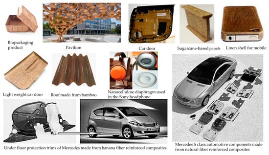 NBCs formed by polymeric matrix reinforcement with natural fibers have widespread applications in different fields due to their excellent thermal, mechanical, and biodegradable properties. Aerospace, automotive, packaging, military, construction, naval, sports, medical, and building block sectors represent significant applications of NBCs for obtaining superior performances, as shown in Figure 11 [,]. Bio-based composites provide lighter weight body parts for cars and airplanes, along with protection against heat and any external impacts. The tremendous interest and research studies on this sector are also gradually reducing the processing costs. The Toyota motor company proposed an eco-friendly bio-based car concept through designing polyester reinforced with hemp for lighter weight seats, body panels, carpets, and different interior parts []. NBCs also have very good potentiality for sustainable manufacturing through using green materials instead of traditional petroleum-based composites []. Electronics and mobile handsets have also drawn attention for implementing the green concept through reducing the harmful ingredients by replacing them with natural fiber-based products [,]. NBCs are considered as prominent safe and harmless materials for the environment, as they are manufactured from bio-based materials, so degradation occurs naturally, with CO2 and H2O as biproducts. The recycling of NBC is simple as the physical characteristics of nanofillers are not affected during the processing due to having a very good thermal stability. Besides, the low loading of nanofillers does not significantly increase the density of NBCs for the high aspect ratio, which provides a very high potentiality of using NBCs. Nanocellulose is gaining popularity in the biomedical industry for its use in scaffolds in tissue engineering, bone reconstruction, systems for drug release, the replacement of skin due to burning, and wound dressings [].