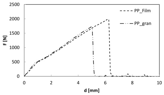 Figure 3 compares reference materials in terms of load–displacement curves at penetration. From the curves, it is possible to note the higher maximum load, Fmax and the corresponding displacement value, d, for the PP film-based specimens (see Table 2).